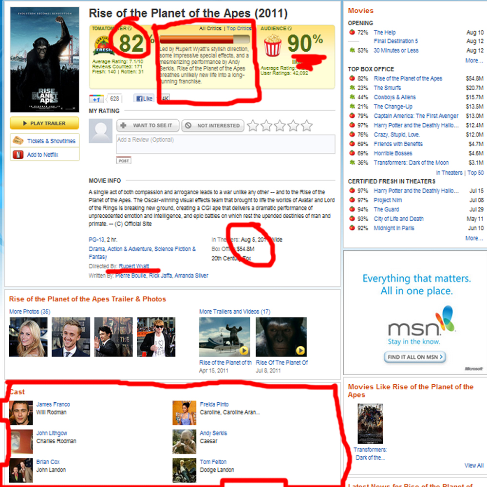 Notice my horrifically drawn red circles and squares. The first top left circle and arguably the most important aspect is the Tomatometer score. People often misuse this as believing how ‘good’ a movie is. And there is a common misconception that if you like a movie that does not have a favorable score you may not have good cinematic taste. Like I said earlier, this is a large misconception. Please remember that this is a percentage. Rotten Tomatoes compiles the reviews of top critics and regular critics and divides their reviews into what could be considered ‘fresh’ or ‘rotten’. The percentage relates how many critics out of all the critics reviews were counted as ‘fresh’. If 60% of the reviews are considered ‘fresh’, the website considers the entire movie ‘fresh’. and given the stamp of freshness as seen next to the percentage itself. It is often misconstrued that the higher magnitude of this score guarantees the that the movie is safe to be considered ‘good’. While there is a strong correlation between the movie actually being good [opinion-based] and the high magnitude of a score, one is not necessarily the cause of another. The score simply represents that given in a room of 100 people, in this case, 82 people will consider the movie good. Whether or not you’re part of the 18 people or the 82 people doesn’t mean there is something wrong with you. If you disagreed with Rise of the Planet of the Apes [see on whether or not I agreed here] you’re not necessarily alone. The most powerful way to use this tool is to use it as a filter in determining which movies you should watch or not. It’s common sense that you’ll likely enjoy a movie enjoyed by 75 percent of people than one that is only enjoyed by about 13 percent of people.
