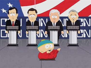 The first three episodes targeted the following subjects in today’s culture: the TSA [Transportation Security Administration], the Cash4Gold craze, and internet memes/republican debates. One of the best things South Park has refined over the years is their ability to take controversial subjects and bring them to absurd and ridiculous versions. In the TSA episode, they used an alternate name: Toilet Security Administration that came about because of men’s inability to properly put the toilet seat down, resulting in the death of a woman who’s insides were vacuumed out due to the suction when she fell in [classic south park]. This Toilet Security Administration has now been enacted to both inspect anyone using a toilet as well as place cameras in each toilet, making fun of the Transportation Security Administration’s laws that are so absurd in how personal they are in the name of illusioned ‘safety’ due to one mere incidence.
