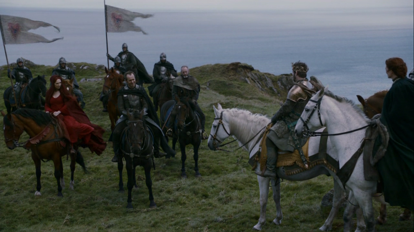 Three story arcs seemingly come together at this point, where Catelyn, Renly Baratheon, and Stannis Baratheon all meet together to do a bit of negociating. I wanted more than ever for Robert to be here, seeing as he’s my favorite character I’d love to see him interact with his brothers, but the chemistry between the two surviving brothers is delicious enough. They debate their sigils, question each other’s religion and claim to the throne, and essentially offer each other amnesty if they join them. Catelyn makes a quip about how she’d smash these twos’ heads together if they were her children, but they just shrug her off to deny their sibling’s claim. Melisandre steals her lines as always, and her red is an amazing contrast to the bleak and misty atmosphere of the ‘Stormlands’. It will be interesting how these two play each other out is all I can say.