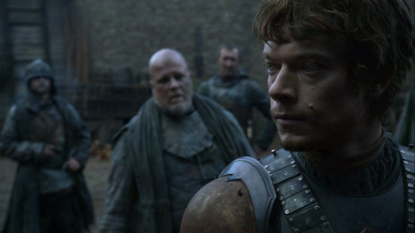 Well Theon’s a tool. An absolute incompetent fool who’s unassurance you can hear in his voice with every ridiculous and stupid step he takes. As he tries to hold Winterfell, the departure of the two young princes infuriates him. He tries to locate them, but is unable to until one of his men gets an idea that has to do with some old burnt things he found in the hay. Now I’m not sure the viewers are supposed to know what it was exactly as the books were vague about it too, but the point is clearly seen the last frame we’re given. The bodies of two charcoal black children were raised at the walls of Winterfell for the eyes of its residents to behold. It’s official ladies and gentlemen, Theon is a child murder and it appears we just lost another two major characters to the story.