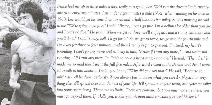 Well this makes me feel flabby. I’m not near overweight, nor am I very cut. But I feel as though I wish I could be like this. Living life to the philosophy of one of the greatest martial artists would not be a wasted life. Maybe I should just roll over and die now for prioritizing writing this blog than making my body like a temple. Regardless, I love this kind of story. It’s simple, the message is clear, and it’s equally invigorating to give me the motivation to actually do something. Could I run three miles in twenty two minutes? Not likely, but it’s a goal definitely worth striving for.
