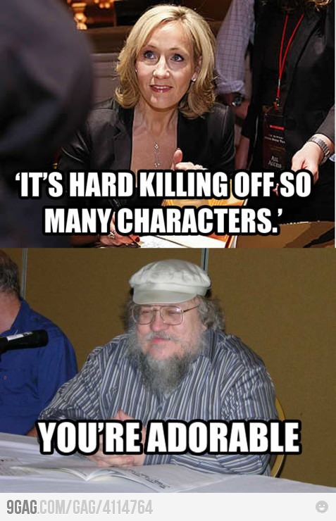 But to the interested, but uneducated in book culture. J.K. Rowling is referencing her quote regarding how difficult it is to kill of some ‘major’ characters in her book series like, SPOILERS —————Snape, Sirius, etc. ————————END SPOILERS. Then we have George R.R. Martin who gives a mocking look because the man LOVES killing off major [see how I don’t use quotes there] characters.