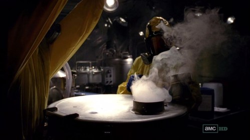 In a nice montage, the Chefs were back to work in the fumigating house. A lot smaller than the lab they were accustomed to, it was nice to see them actually cooking. Combined with a smooth track, some neat machinery at work [being a chemical engineer, I thought it was all truly fascinating], and some generic [though probably actually scientific] chemical sequences [much like the ones you see in your Biology class], it was a neat way to emphasize what they were doing and how it was more like clockwork to them.