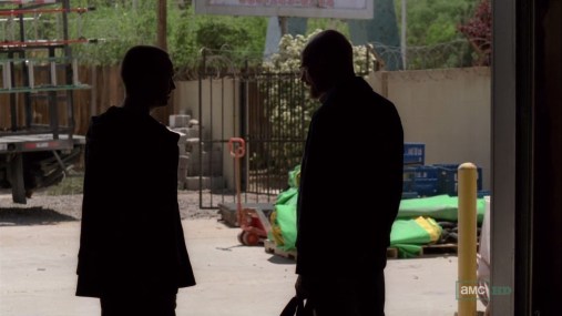 The episode opens up covering some of the loose ends from the last episodes: Mike’s 8 or so other guys. It appears he’s visiting them one by one to assure them that they’re being taken care of so they don’t snitch. The lawyer covering up his ears so he doesn’t hear anything was a nice touch. Since Mike decided to go back into business with Walt and Jessie, he can calmly reassure each of them that they’re families will be taken care of and that they’ll see what they’re due by the time they leave the jail, which is known as Hazard Pay. What Mike’s guy says about the other guys possibly flipping may come back to bite by the end of the season.