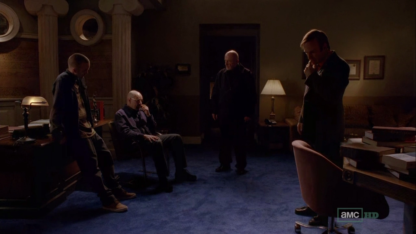 Back at Sauls, the four: Walt, Jessie, Mike, and Saul convene to talk about their new dream team. Saul is hesitant to allowing the once enemy Mike into their ranks, but Walt calmly reassures him that there will be no issue. During the meeting Mike gives them [mainly Walt] an ultimatum: Walt Handles the Cooking and that Mike Handles the Business. At first, Walt nonchalantly acknowledges this notion, seeing as he truly didn’t understand how Gus’s business worked. But when Saul approaches Walt alone about how okay he is with this he simply responds, “He handles the business, and I handle him”. This attitude is another coal to the fiery power struggle between Walt and Mike.