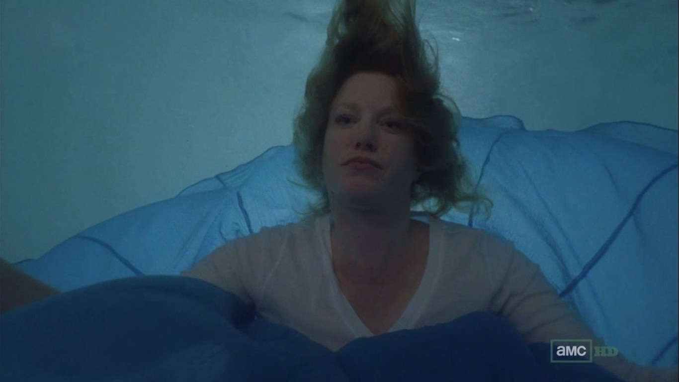 During Walt’s rather touching conversation about how a year has passed since his diagnosis, Skylar takes a deep look into the pool. She slowly makes her way down, ignoring the pleas and warnings of her family. As she submerges her head in the pool, she gives a look of feeling lost, powerless. It’s pretty unknown if she meant to stay down there until she drowned, but she was saved by Walt at the last second. The repercussions of this affect the whole episode, because we learn that Skylar did this on purpose to send the kids away from the hostile environment that Skylar claims their home to be. Walt’s reaction on that matter below.