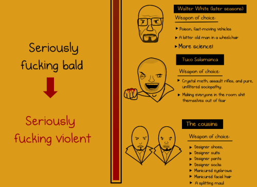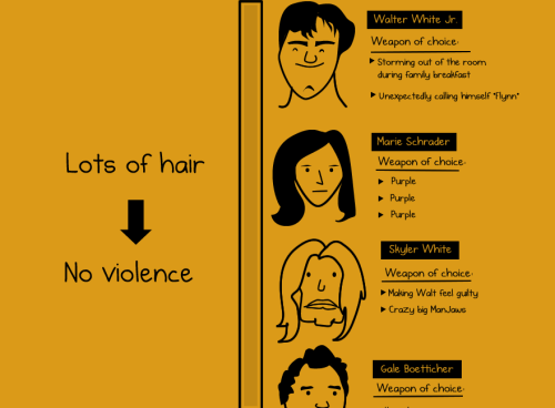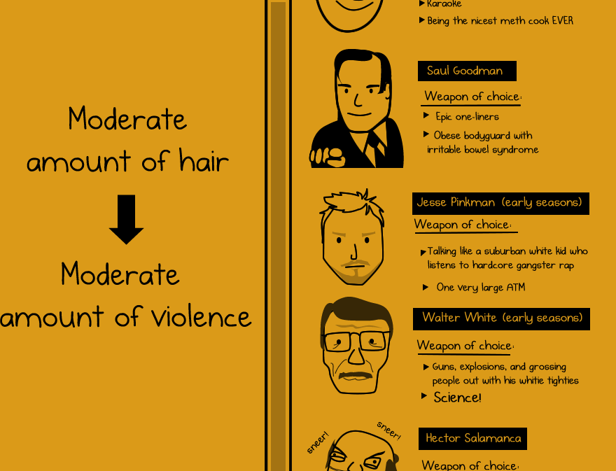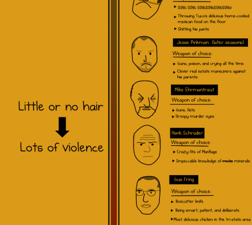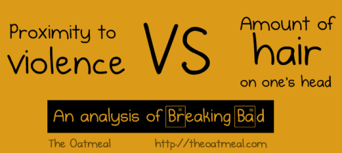 Here’s an awesome infographic by the Oatmeal. He has awesomely observed that the more hair you have on this show, the less dangerous you are. And if you’re bald, you’re like a psycho. It goes through all the characters on the show including those dead and main characters over time. In addition, he’s included some hilarious ‘weapon of choices’. Saul Goodman’s include ‘Epic one-liners’ and awesomely enough Walter’s weapon of choice in both early and later seasons include Science. Check out the whole infographic below and be sure to visit the Oatmeal.