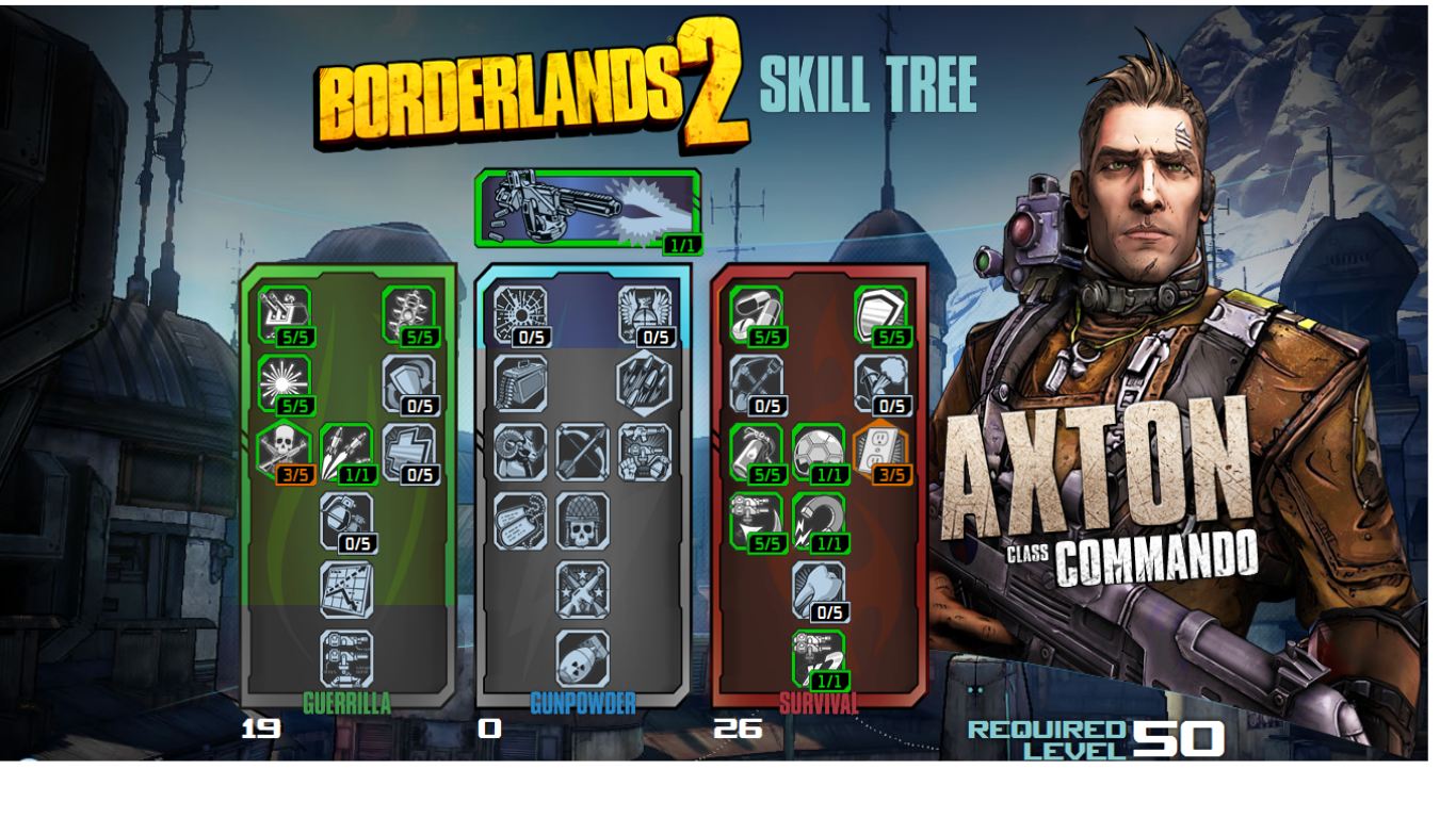 In my time playing as Axton, there are two builds that I utilize that will be covered in this post, neither of which involve the standard gunpowder trees as I just can’t justify putting points into it. This is purely because my builds are focused on playing with a fully diverse team of 4 people. Keep in mind that these builds are my favorites and in my opinion the best ways to build the Commando, but may not be the case in terms of logistics.