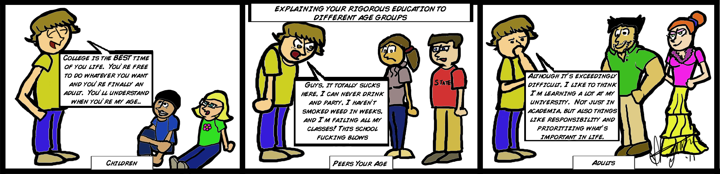 For more of my art, go hereI’ve been working on my art, there are only a couple more of these Universidaze comics with sub par drawing and coloring. I’ve been experimenting with coloring, shading, and outlining, and I think you guys are really going to like the outcomes. After this comic, I believe there’s one more left from the old batch, then we’ll be switching to a a new artistic style.