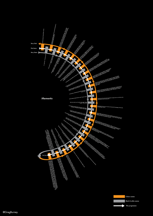 Follow @GregBurney  for this rendition and awesome breakdown of the one of Christopher Nolan’s first movies Memento.  If you haven’t seen this movie, it’s probably one of film buff’s 101 movies to watch.  The style, the story, the performance.  Everything about this movie will make you fall in love with the industry like I have.  And it’s clear that others who have fallen in love with the industry can create graphics like this to absolutely blow people’s mind just as much as the movie did.