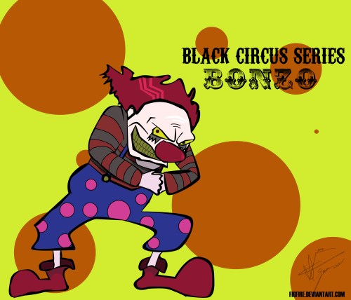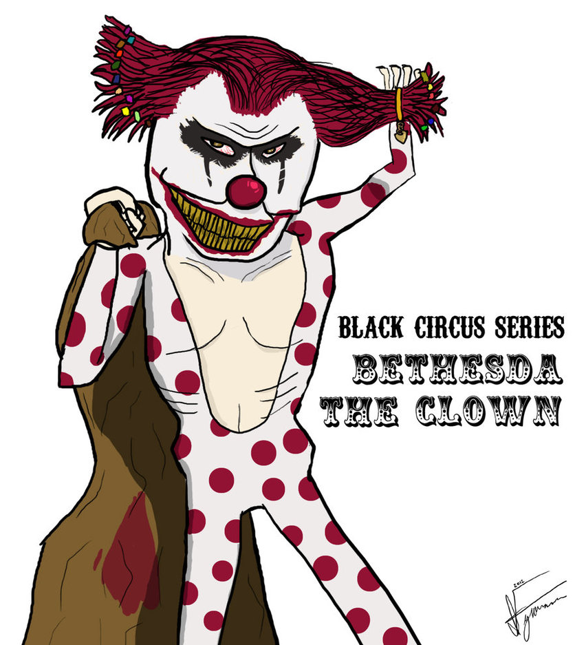 A smile never leaves Bethesda’s face. Long before he donned the clown outfit and the name Bethesda the Clown, his name was Arthur White and was always found with a smile on his face due to a genetic disorder. Talented with a dagger, he spent majority of his boyhood in the woods hunting and skinning animals. After witnessing his parents’ murder, the police sent him to an asylum after deeming him responsible on the basis he was found at the crime scene, knee deep in their blood with a smile and tears on his face. Unjust incarceration, cruel isolation, and unethical experimentation led him to mistrust people in their entirety. The only friend he had was a small boy by the name of Bethesda in the cell adjacent to them. One day Bethesda didn’t return to his cell and White went berserk. Rumor has it he left 20+ dead and no survivors, and found Bethesda in a morgue with a dozen more children. After this series of events, White wandered forever scarred emotionally and physically with a distrust in everyone. The day he stumbled into Ben’s Black Circus would change him forever.