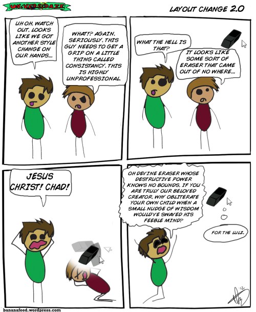 The adventures of Chad and Miles seem to be over for now. It’s such a shame, considering I’ve grown very fond of the two of them and I feel as though I could’ve done so much more. The Universidaze tab will remain here for all those who wish to go back and read some of the older comics. I plan on playing around with the hyperlinks and making the page much nicer as a final send off. But who knows, maybe they’ll survive the crash. Maybe they’ll make a comeback. We can only wish and dream.