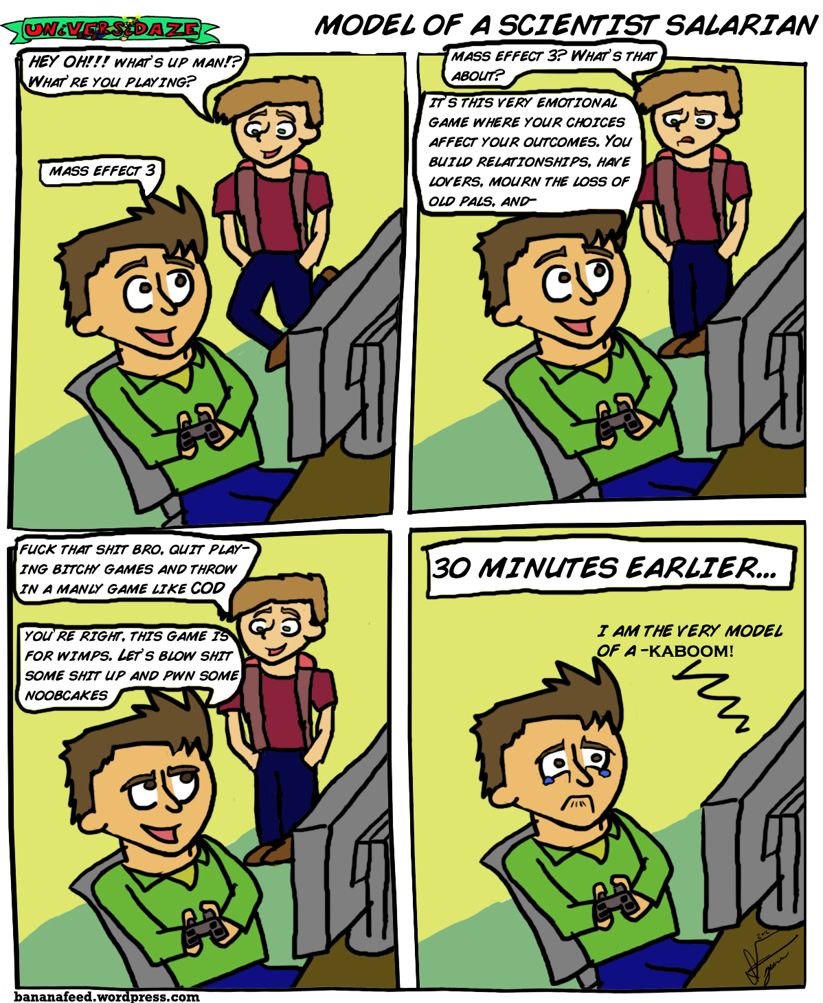 Mass Effect has significantly changed my life when it comes to gaming. I used to not be such a big video game guy as it took me nearly 5 years to finally get a PS3 after it was released. Mass Effect 2 was among the first game I got. While it was difficult to get into, not playing Mass Effect 1 and buying it used so I couldn’t control decisions from the first game, I managed to eventually persevere through it and get all the correct DLC to get the way I wanted. By the time Mass Effect 3 came out, I spent 30 hours gaining everyone’s loyalty and etc., I had successfully gotten a fairly perfect Paragon mode with all my crew members. I spent another 30 hours playing through Mass Effect 3 and my Paragon Male Shepherd chose the synthesis route and I thought I was done and satisfied.