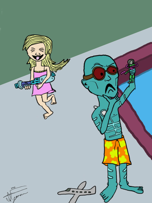 The tablet is alive!!!  I reset all my preferences and my Bamboo Tablet is back in business.  For the first time in a long time, here’s a Sunday Sketch.  My ‘Batman Universe as Children’ gallery gets another addition with young Victor and Nora Fries play by the pool.  The future Mr. Freeze finds a neat astronaut suit action figure while Nora steals his favorite water gun.